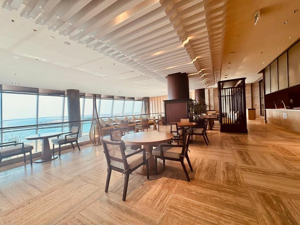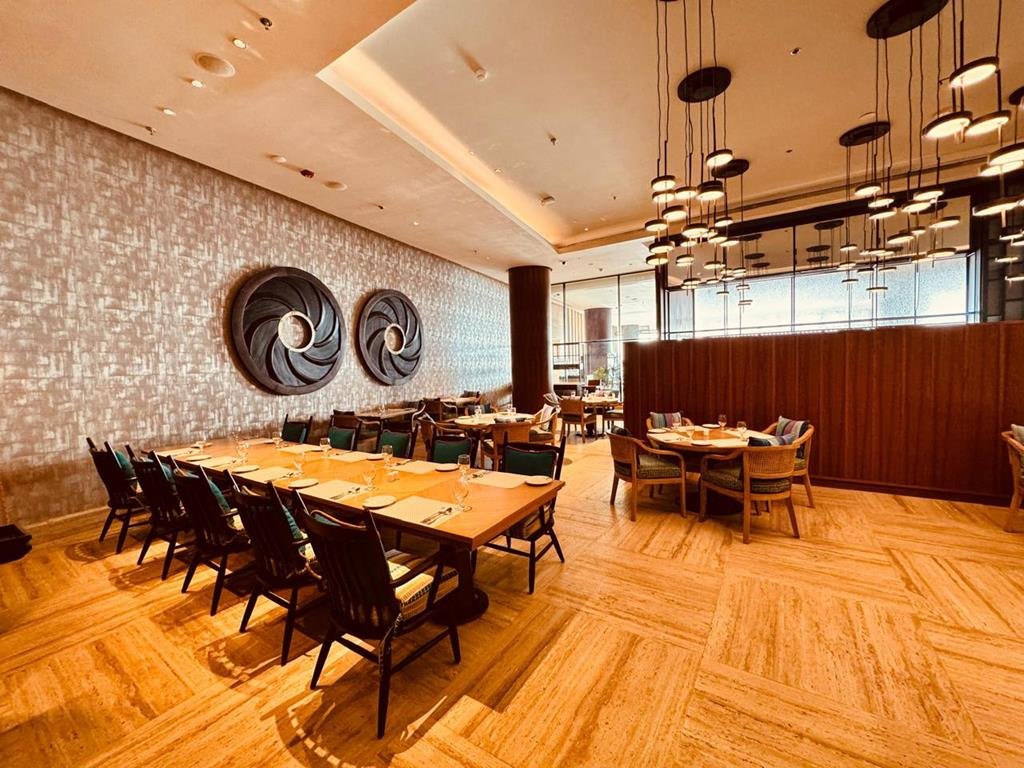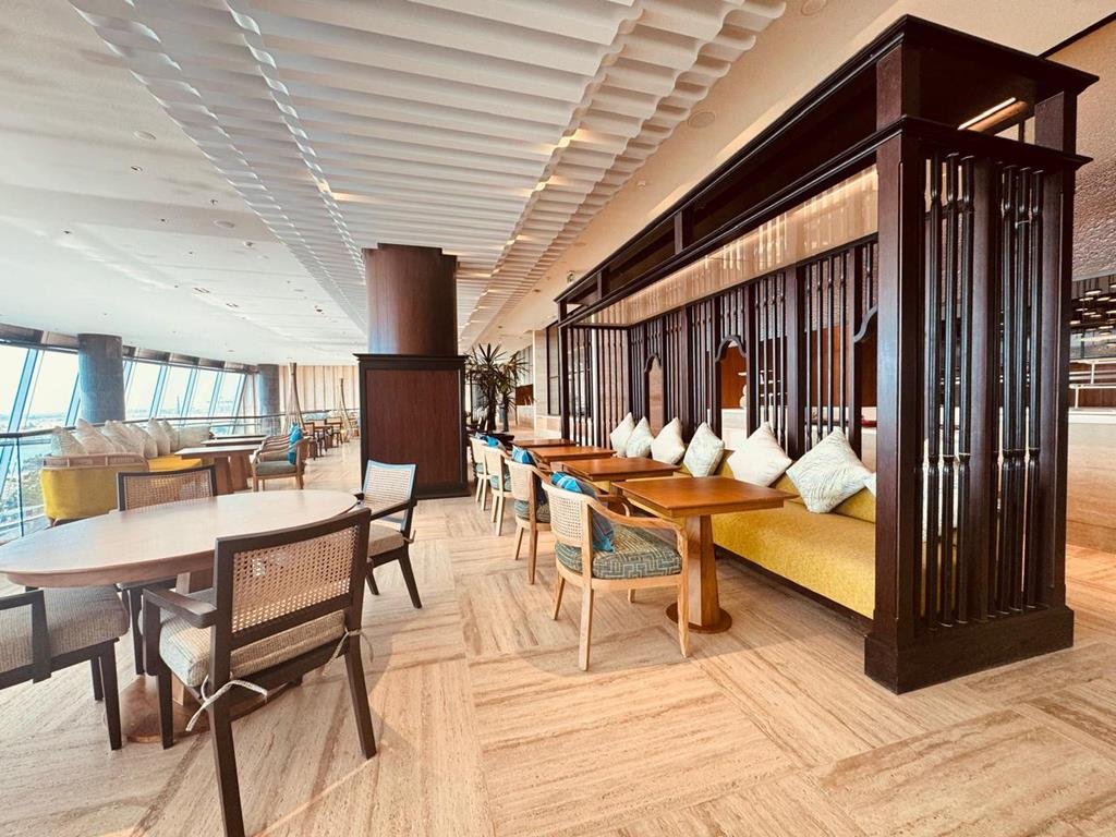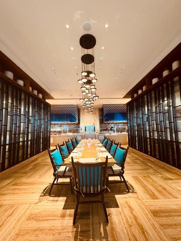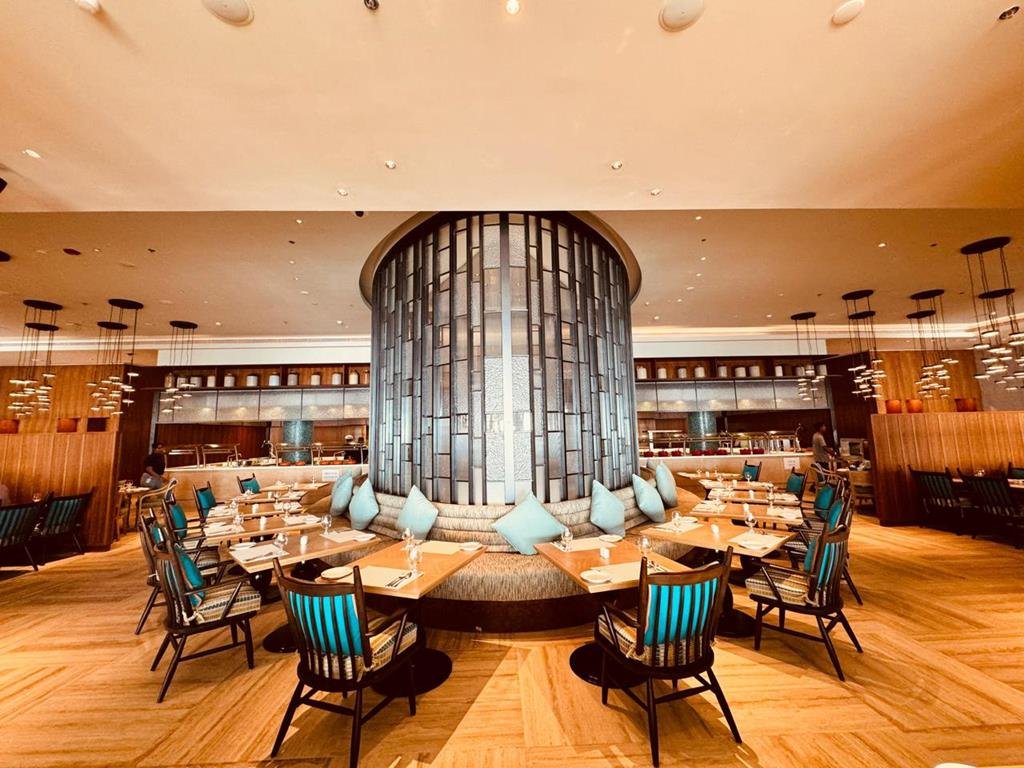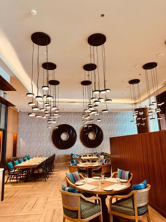 The completed interior for the all-day dining restaurant area named the Indian Ocean Pavilion at ITC Ratnadipa showcases a blend of sophistication and coastal charm, offering panoramic views of the ocean from its glasshouse setting. The design features meticulously crafted elements including: